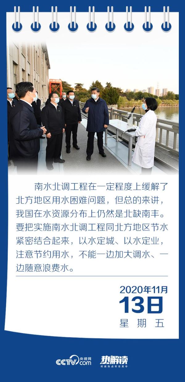 11月13日下午,正在江苏考察调研的习近平总书记来到扬州江都水利枢纽,了解南水北调东线工程和江都水利枢纽建设运行等情况。