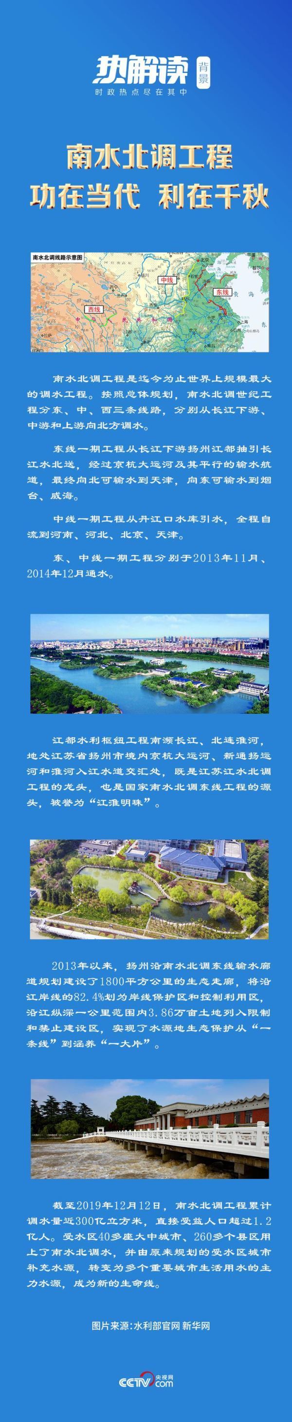 2014年12月,南水北调中线一期工程正式通水时,总书记又作重要指示,指出南水北调工程功在当代,利在千秋。希望继续坚持先节水后调水、先治污后通水、先环保后用水的原则,不断造福民族、造福人民。