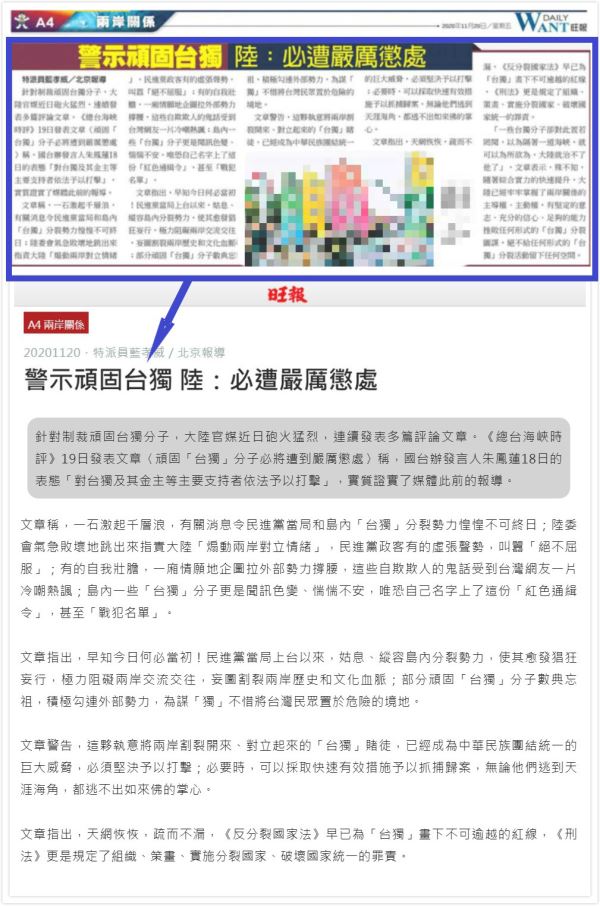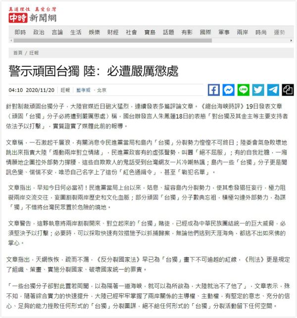 台湾《旺报》、中时新闻网、台湾雅虎新闻等岛内媒体将“总台海峡时评”视作大陆官方表态,第一时间刊载文章内容指出,顽固“台独”分子,必遭严厉惩处。
