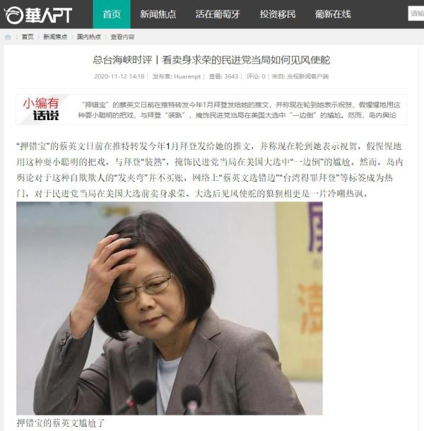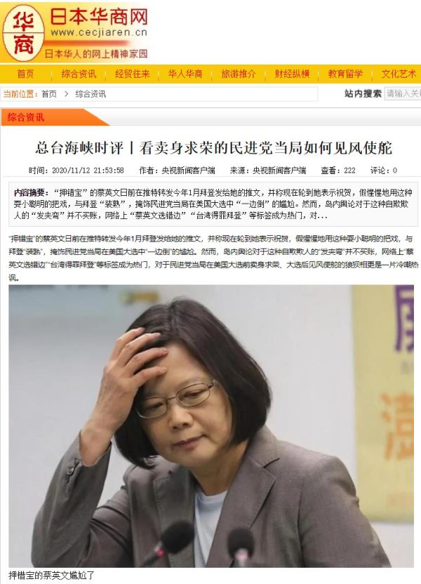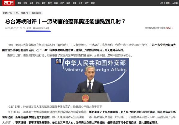11月7日至11月19日,中央广播电视总台“看台海”新媒体平台连续发布《历史昭示未来 事实从未改变》《看卖身求荣的民进党当局如何见风使舵》《一派胡言的蓬佩奥还能蹦跶到几时?》《顽固“台独”分子必将遭到严厉惩处》等四篇“总台海峡时评”,重磅出击,给“台独”以极大震慑!系列评论充分揭露民进党当局见风使舵、卖身求荣的丑恶面目,有力批驳某些美国政客妄图搅乱台海、分裂中国、遏制中国的狼子野心。评论重申,大陆和台湾同属一个中国的事实从未改变,民族复兴、祖国统一,是包括台湾同胞在内的全体中华儿女的共同责任。严正警告一切“台独”分子,若执迷不悟、顽抗到底,必将受到两岸人民的共同谴责和法律的严厉惩处。