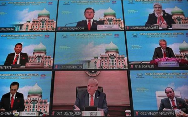 亚太经合组织第二十七次领导人非正式会议上,20位国家领导人,都在视频会议中使用了官方背景——蓝底加马来西亚总理府。