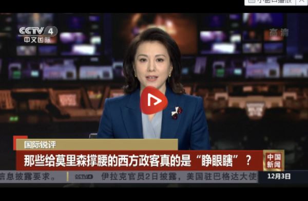 12月3日,央视中文国际频道《中国新闻》摘播《国际锐评:那些给莫里森撑腰的西方政客真的是“睁眼瞎”?》。评论指出,美英等国与澳方沆瀣一气,不过是想通过对华示强,来防止自身罪行暴露、“人权”假面被揭开。