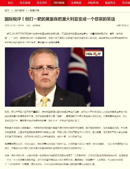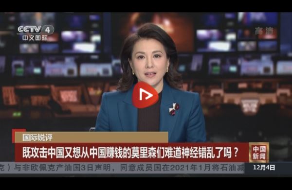 12月4日,央视中文国际频道《中国新闻》摘播《国际锐评:既攻击中国又想从中国赚钱的莫里森们难道神经错乱了吗?》。评论指出,莫里森自相矛盾的神经质式表演,不过是一个“老油条”政客的把戏。