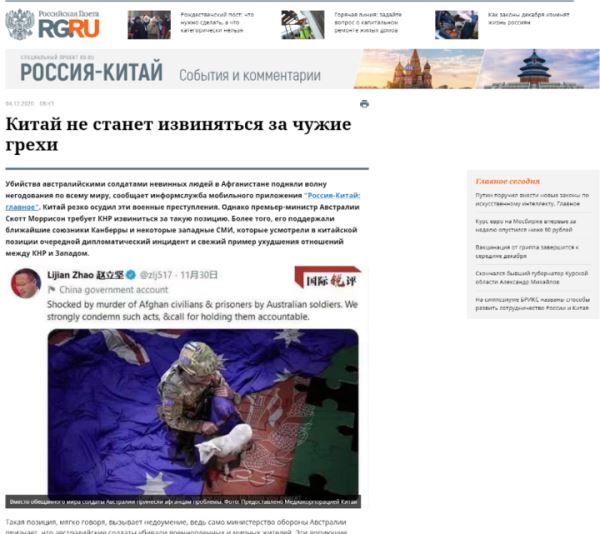 俄罗斯政府机关报《俄罗斯报》官网分别以《头疼嫁祸他人》(意为将自己的罪责转嫁给他人)《中国不会为别人的罪行道歉》《澳大利亚不想失去中国市场》作为标题,连续转引国际锐评3篇报道。报道称,对战争犯罪的纵容以及对正义的蔑视,正让一些打着和平旗号的西方军队成为恐怖分子的帮凶,成为和平与正义的践踏者。
