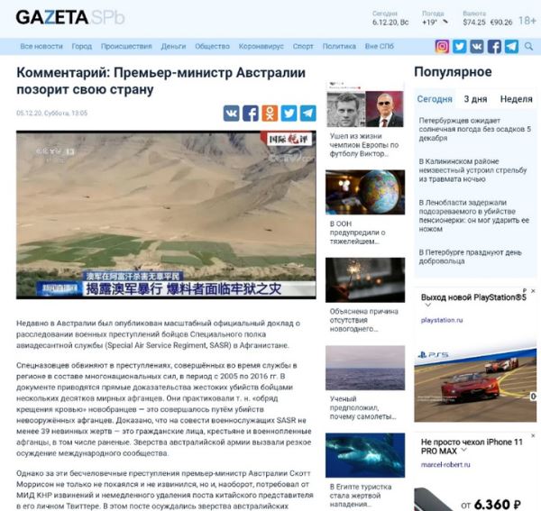 俄罗斯《圣彼得堡报纸网》官网刊文《评论:澳大利亚总理让自己的国家蒙羞》。