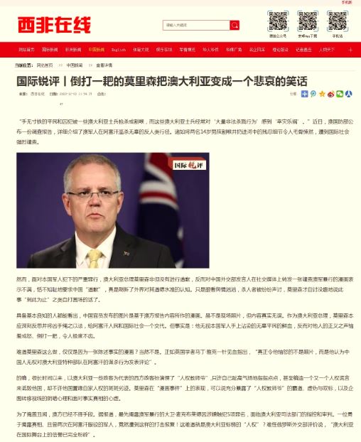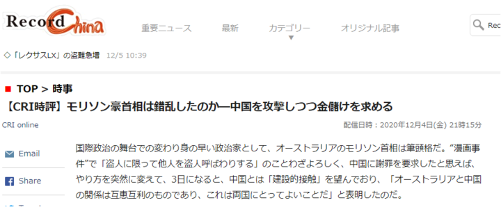 日本最大的中国信息网站Record China连续转引国际锐评3篇报道,并分别以《莫里森错乱了吗?既攻击中国又想从中国赚钱》《给无理取闹的莫里森撑腰的西方政客》为题,回顾回顾莫里森上台两年来,一直都在采取投机主义政策。这种危险的“走钢丝”不可避免地使其政策表现出纠结错乱,一步步把澳大利亚带入作茧自缚的困境 。同时,文章说,对一些抱有顽固意识形态偏见的西方政客认为,他们可以动辄对中国和其他看不顺眼的国家指指点点,却不允许中国反过来批评他们的斑斑劣迹。