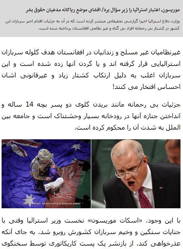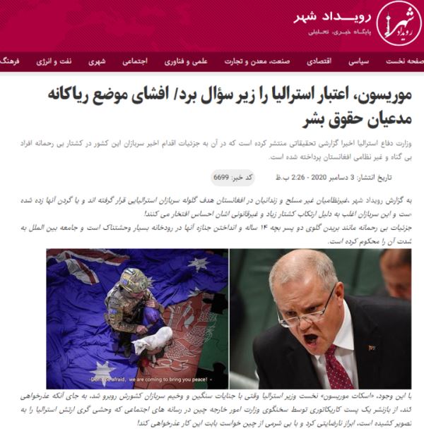 伊朗环球在线网、伊朗城市新闻网、伊朗即时消息网、《新鲜资讯》网站转发总台报道,发布题为《莫里森把澳大利亚变成一个悲哀的笑话》《那些给莫里森撑腰的西方政客真的是“睁眼瞎”?》的文章。