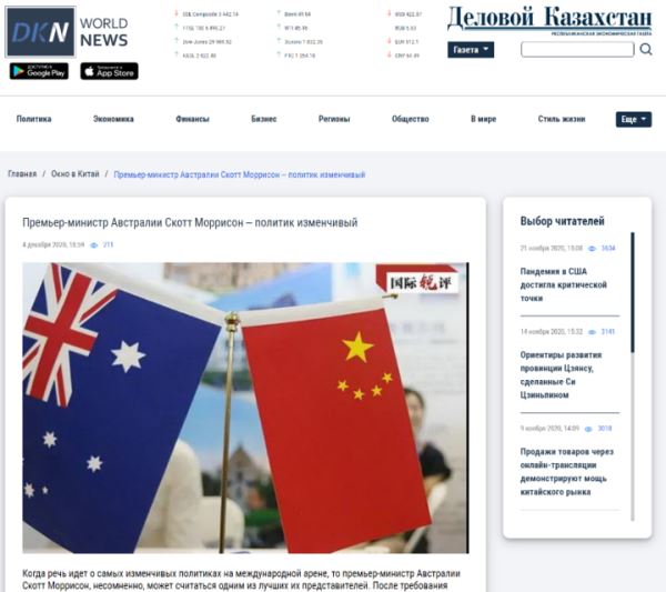 哈萨克斯坦《今日哈萨克斯坦通讯社》、《哈萨克斯坦实业报》发布题为《评论:澳大利亚总理让自己的国家蒙羞》《澳大利亚总理使自己国家蒙羞》《奇怪的莫里森为何要求中国向澳大利亚士兵道歉》《澳大利亚总理莫里森:一个善变的政客》的报道。“今日哈萨克斯坦”通讯社官网刊文《倒打一耙的莫里森把澳大利亚变成了一个笑话》。