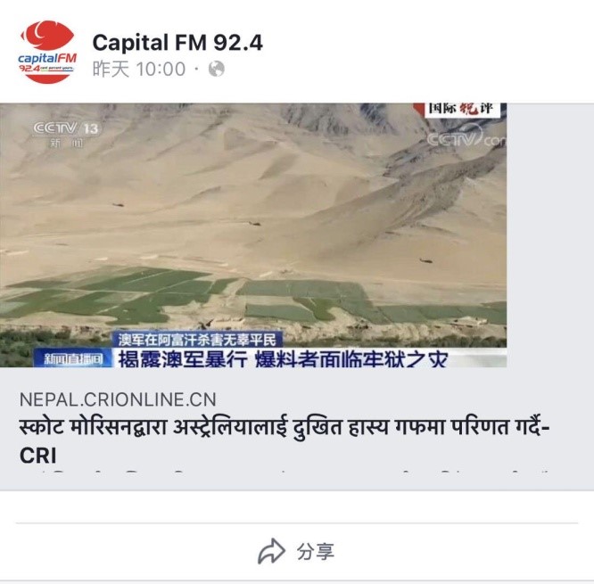 尼泊尔都市在线网12月3日在其脸书官方账号转发总台《国际锐评丨倒打一耙的莫里森把澳大利亚变成了一个悲哀的笑话》,题为《斯科特·莫里森将澳大利亚变成悲哀的笑话》。
