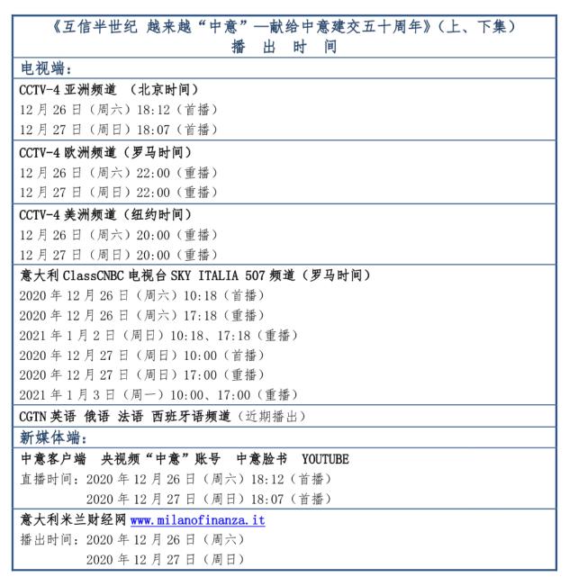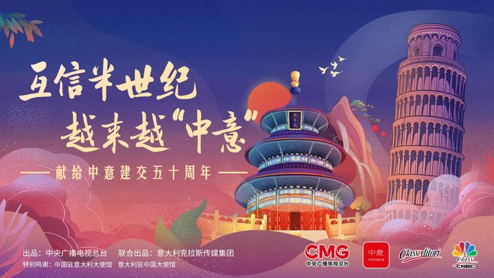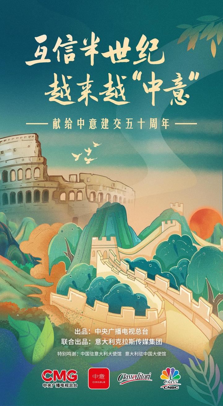 2020年是中国和意大利正式建立外交关系50周年。为纪念两国建交并彰显中意关系的蓬勃稳健发展,由中央广播电视总台与意大利克拉斯传媒集团合作拍摄的纪录片《互信半世纪越来越“中意”——献给中意建交五十周年》12月26日和27日在总台央视中文国际频道、中意平台、意大利ClassCNBC电视台、意大利MilanoFinanza网等中意媒体平台同步首播。