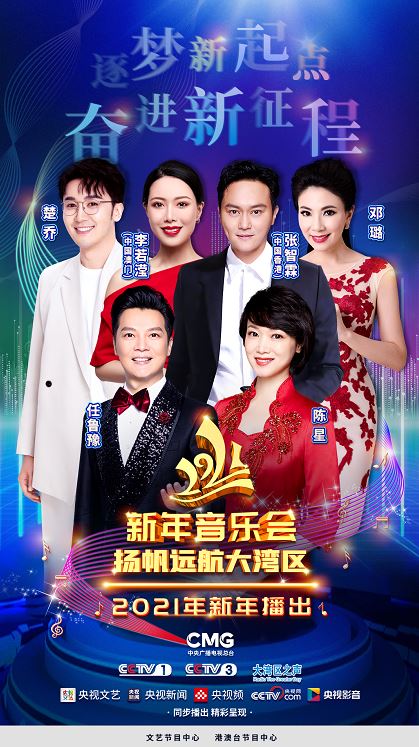 中央广播电视总台主持人任鲁豫、陈星 ,广东卫视主持人邓璐 ,深圳卫视主持人楚乔 ,以及来自中国香港的张智霖 ,中国澳门的李若滢组成豪华主持阵容;明星廖昌永、张韶涵、王大陆 、沈月、孙楠将齐聚《2021新年音乐会——扬帆远航大湾区》。