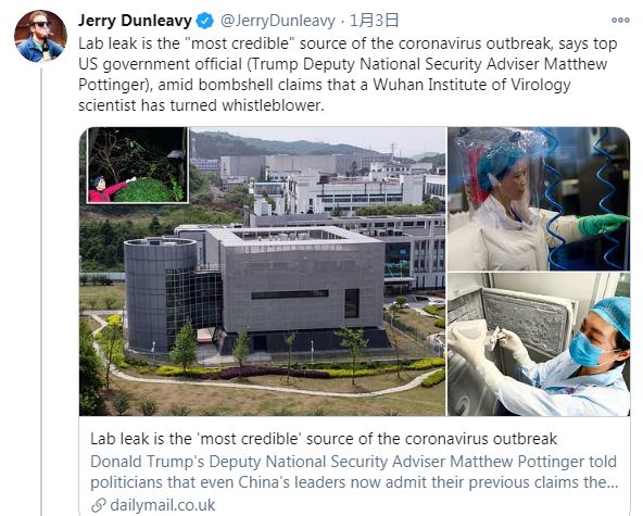 事件起因是《华盛顿观察家报》(Washington Examiner)美国司法部事务记者杰瑞·邓利维(Jerry Dunleavy)在2021年1月3日发布的关于新冠病毒的两条推文。他分别转推了《华盛顿观察家报》和英国《每日邮报》(The Daily Mail)的两篇文章,援引时任美国副国家安全顾问博明称,新冠病毒“最可信”的来源是武汉病毒研究所,“美国17个情报机构中的大多数都相信病毒或起源于那里的一次意外泄漏”。