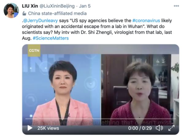 注意到这两条推特之后,刘欣认为有必要作出回应。她想到自己曾专访武汉病毒研究所的石正丽博士,于是截取专访片段进行驳斥。刘欣写道,这位美国记者说美国情报机构相信新冠病毒或源于武汉一个实验室的意外泄漏。科学家们怎么说?我去年(2020年)8月采访了这个实验室的病毒学家石正丽博士”。视频中石正丽明确表示,2019年12月30号之前武汉病毒研究所里没有这个病毒,因此“泄漏”一说无从谈起。刘欣还加上了“科学很重要(ScienceMatters)”的话题标签。