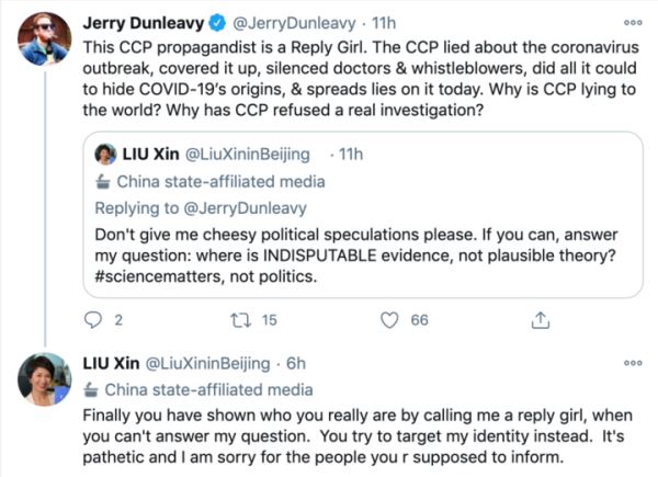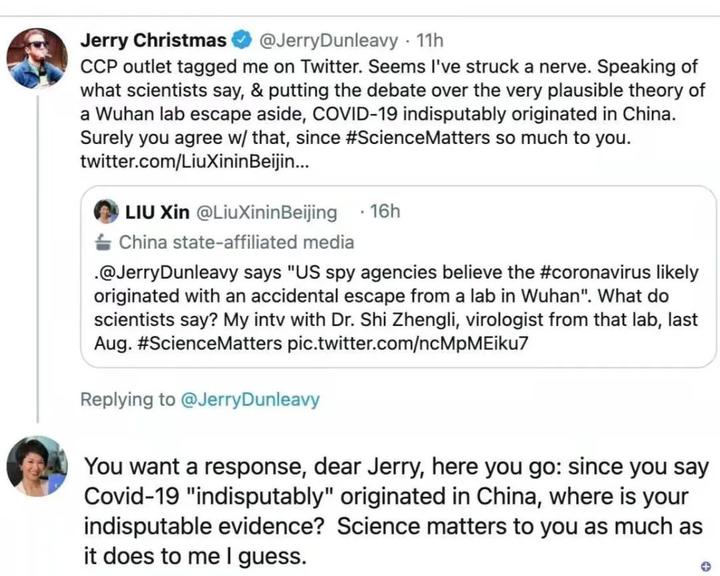 就此,刘欣并没有退缩。她回应道,你想要一个回复,亲爱的杰瑞,就给你一个吧:你说新冠肺炎“不可争辩”地源于中国,你“不可争辩”的证据在哪里?我猜,你一定和我一样重视科学。