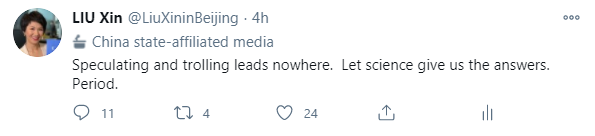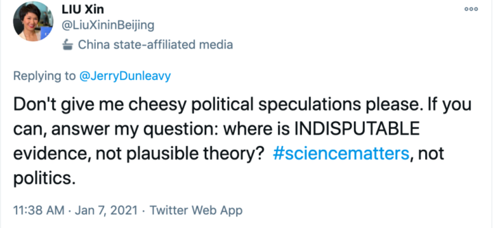对于这样的回答,刘欣当然表示不满意。她留言称,请不要给我这些陈词滥调的政治化推测。如果你可以,回答我的问题:你“不可争辩”的证据,而不是貌似可信的理论,在哪里?科学很重要,而不是政治。