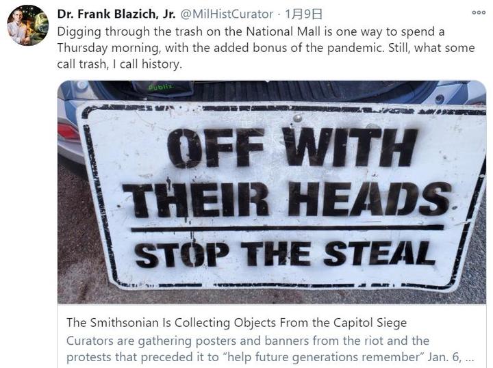 △当地时间9日,国立美国历史博物馆策展人、历史学家弗兰克·布拉奇克(FrankBlazich)在其个人社交平台上发布搜集国会骚乱遗留物的消息。(图片来源于网络)