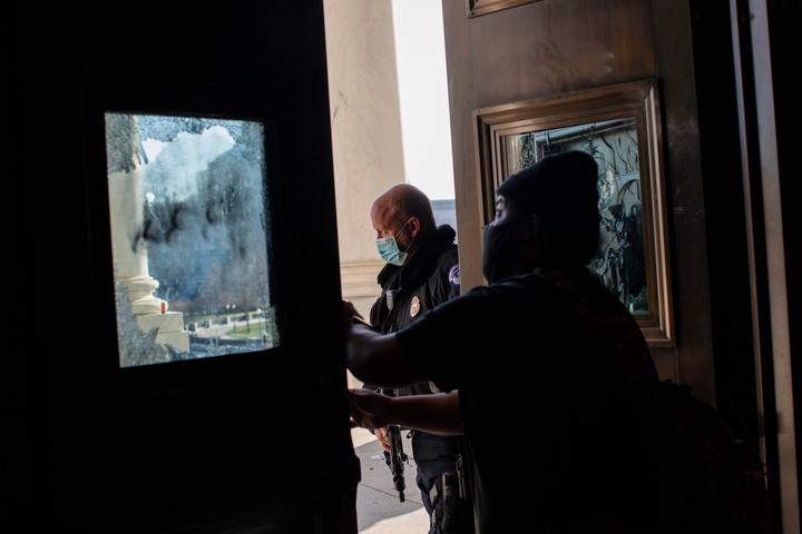 国会大楼内部,但凡是有窗户的地方,窗户靠内一侧的地面上往往都会摞着一地玻璃碴。因为大门被封堵,众多抗议者在骚乱当天寻找着窗户,将玻璃敲碎后翻窗进入国会大楼。