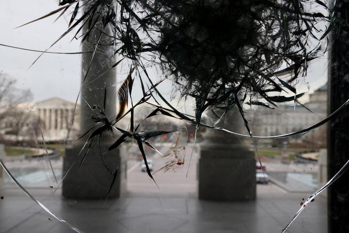 在国会大厦的入口,大厦正门上镶嵌的双层玻璃窗一侧被打碎,另一侧则被黑色喷漆涂上了涂鸦。