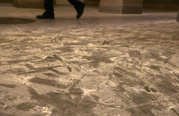 当天国会大厦警察为驱散抗议人群所使用的胡椒喷雾、催泪瓦斯,以及灭火器残留物给国会大楼的地板盖上了一层灰白的粉末。