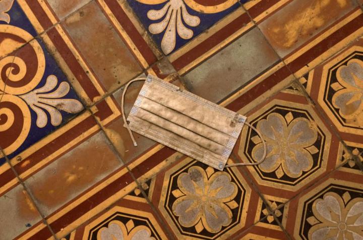 骚乱过后,国会大厦的一处走廊上留下的一只口罩。在疫情期间,本次参与抗议的人群大都不支持佩戴口罩,国会警察在维持秩序时为了防止催泪瓦斯和胡椒喷雾的误伤,大都直接佩戴了防毒面具,所以仍不清楚这只口罩的主人属于哪一方。