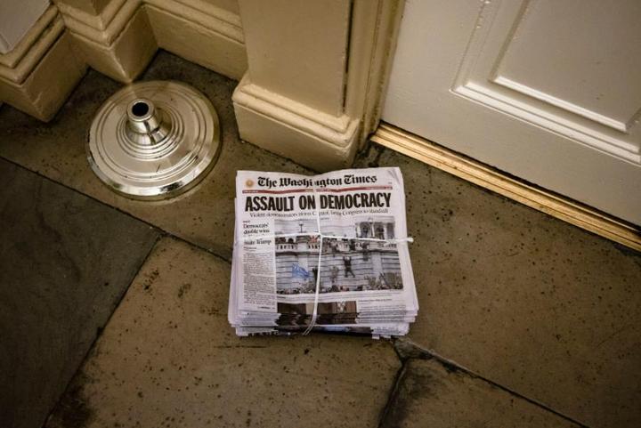 颇为讽刺的是,在美国国会山经历混乱的一天后,7日一早,刊登题为《对民主的袭击》头版文章的《华盛顿时报》被准时送到了破乱不堪的国会大厦办公室门外。而这篇头条报道,讲的正是前一天在这里发生的故事。
