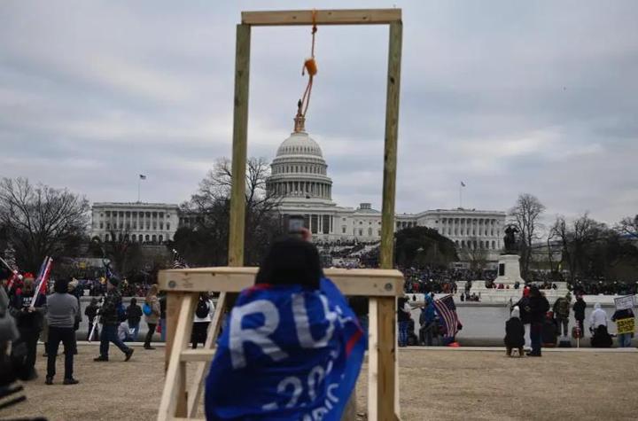 除了这些口号和标语,根据美国媒体的报道,国会骚乱当天,抗议人群在国会外的空地上架起了一个木制的绞刑架。绞刑架的套索正对着美国民主制度的象征——国会大楼。颇有意味的是,搭建绞刑架的是美国人。绞刑架对准的,却是美国国会大楼。