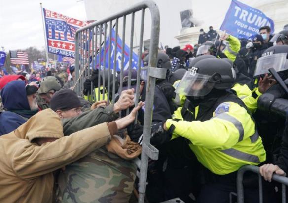 △6日骚乱暴发当天,抗议民众与国会大厦维持秩序的警察发生暴力冲突。