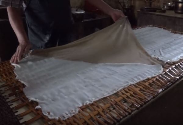 我们自家也会做玛皮。那时单位饭堂里有个大大的手推石磨,我们洗好米,放在桶里用水浸泡两三个小时,等米浸透泡软后,就一勺勺舀进石磨,碾成米浆。接下来兑水,米浆的稀稠度将决定玛皮口感的好坏。水放多了,玛皮会稀烂不成型;水放少了,蒸出来就易老、干硬。将恰到好处的米浆均匀地铺在刷了香油的扁圆簸箕上,烧沸一锅水,放上去蒸三两分钟就好。取出,细裁玉纸般地切成粉条状。
