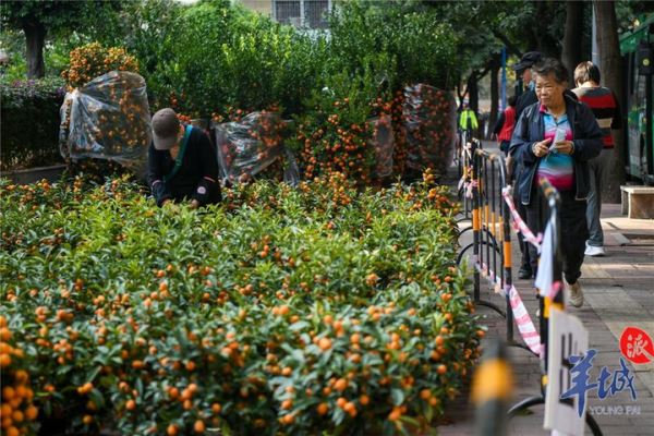 Árvores de laranjas e floresfestival com cores diferentes são colocadas aos dois lados de ruas