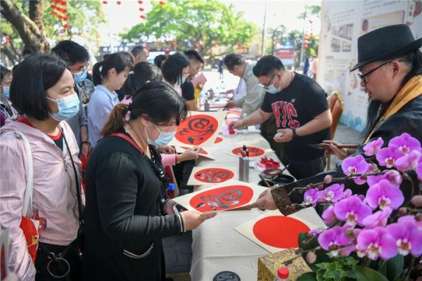 No parque Shanding da Motanha de Baiyun, calígrafos mostram carácter manuscrito “Fu” aos vizinhos