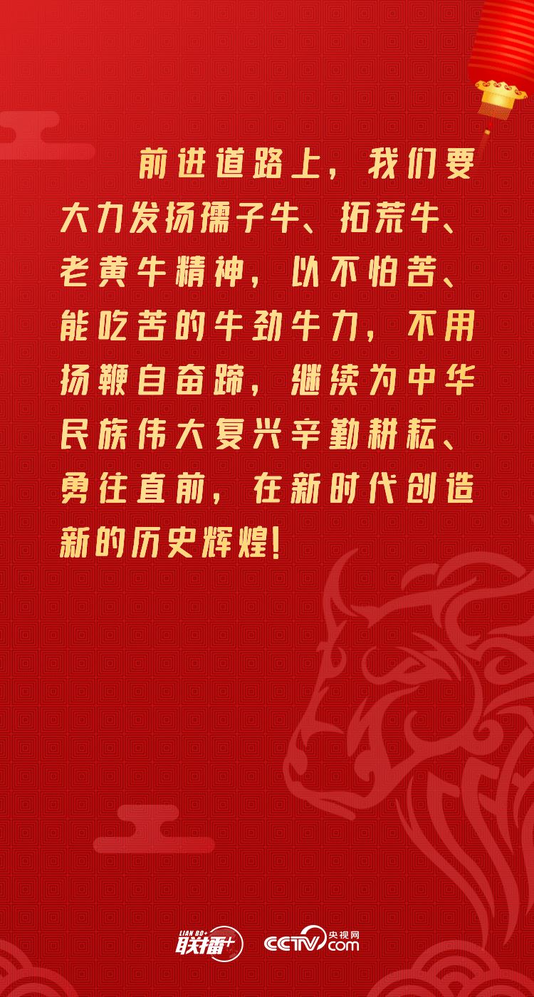 在中华文化里,牛是勤劳、奉献、奋进、力量的象征。犹记2020年12月31日,习近平总书记在全国政协新年茶话会上强调“发扬为民服务孺子牛、创新发展拓荒牛、艰苦奋斗老黄牛的精神”。此次,总书记再次提到“三牛”精神,并号召全党全国各族人民“不用扬鞭自奋蹄”,在新时代创造新的历史辉煌。