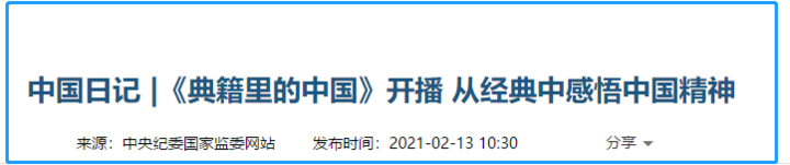 2月13日,中央纪委国家监委网站发布文章《中国日记丨〈典籍里的中国〉开播 从经典中感悟中国精神》,文中解读了今人为何要读典,以及华夏文明薪火相传的魅力。