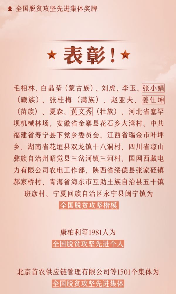 今天上午,全国脱贫攻坚总结表彰大会在北京人民大会堂隆重举行,中共中央总书记、国家主席、中央军委主席习近平向全国脱贫攻坚楷模荣誉称号获得者颁奖并发表重要讲话。