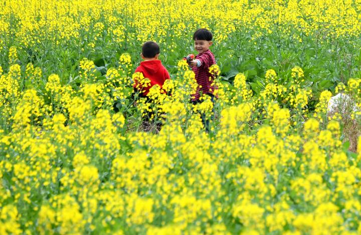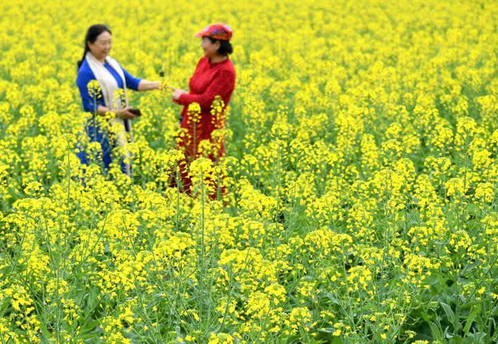 近日,福州天气转暖,福建省福州市郊外的闽侯县鸿尾乡鸿尾村的油菜花种植示范基地里,油菜花竞相绽放,金灿灿的田园美景吸引不少游客前来踏青游玩。