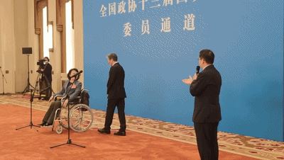 △首场“委员通道”活动上,中国美协主席范迪安推着中国残联主席张海迪退场。(总台央视记者魏毅拍摄)
