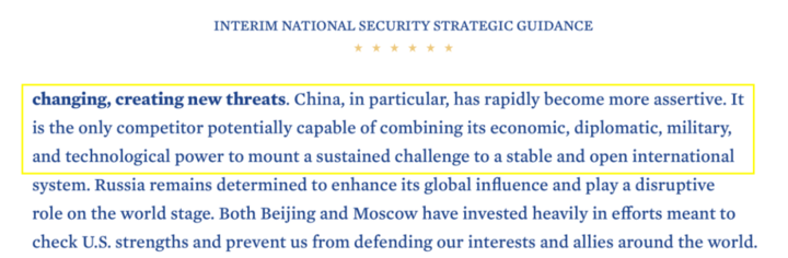 3月3日,美国政府发布《国家安全战略临时指南》,报告中,将中国定义为“唯一有综合实力持续挑战国际秩序的竞争对手”以及“21世纪最大地缘政治考验”。