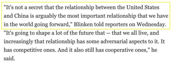 ▲布林肯说:“中美关系可以说是我们未来世界上最重要的关系,这并不是一个秘密。”