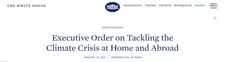 同一天,拜登在白宫签署了一份行政令,标题就是:应对国内外气候变化危机。