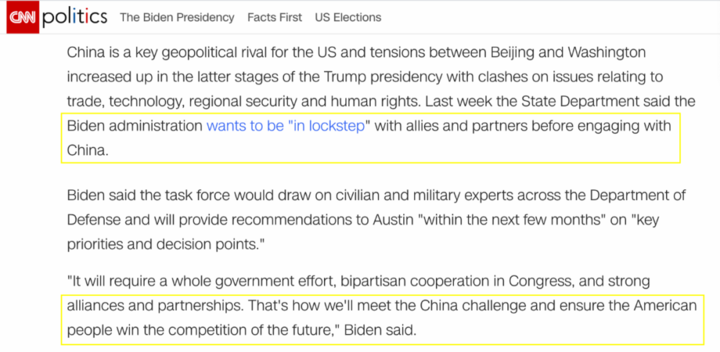 ▲拜登政府希望在与中国接触之前与盟友和伙伴 "步调一致"。拜登直言,工作组就是我们将迎接中国挑战并确保美国人民赢得未来竞争的方式。