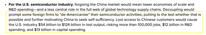 如果在半导体行业对华脱钩,会令美国半导体公司损失高达1240亿美元的收入,导致研发和资本支出分别削减120亿和130亿美元,并导致美国半导体行业失去超过10万个工作岗位。