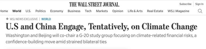 据《华尔街日报》报道,中美双方将共同主持20国集团一个关注气候相关的研究小组。