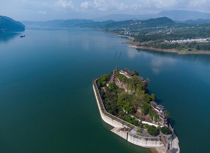 从重庆市忠县县城出发,驱车向东32公里,远远可见一俯四壁如削的巨石立于长江北岸,陡壁孤峰处建有红墙古寨,四面环水,形如玉印,仿若一个集山、水、古建于一体的江中“盆景”。