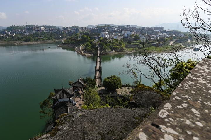 沿岛上高56米的古寨登梯而上,在巨石顶部平坦石坝扶栏远眺,眼前一江碧水沿两岸青山流向远方……
