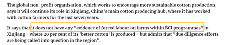 ▲报道称,“BCI表示,在新疆没有发现任何‘BCI项目农场存在强迫劳动的证据’。”