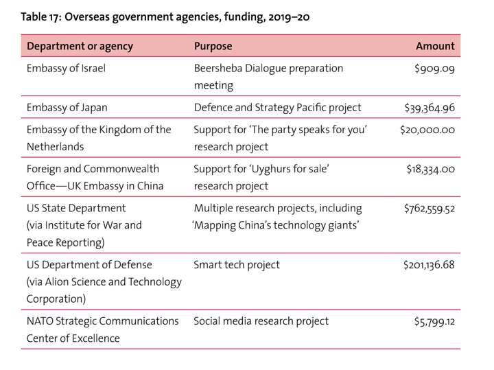 而经常给ASPI提供资金的外国机构,还有美国国务院、美国国防部、北约战略中心。