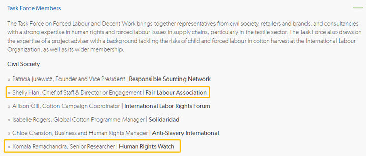 注意这两个人,美国公平劳工协会秘书长兼董事韩雪莉和“人权观察”研究员科马拉·拉马尚德拉。