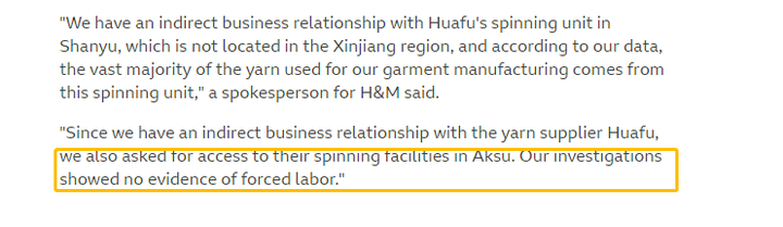 ▲“我们还要求访问他们在阿克苏的纺纱厂,但在调查中没有发现存在强迫劳动的证据。”