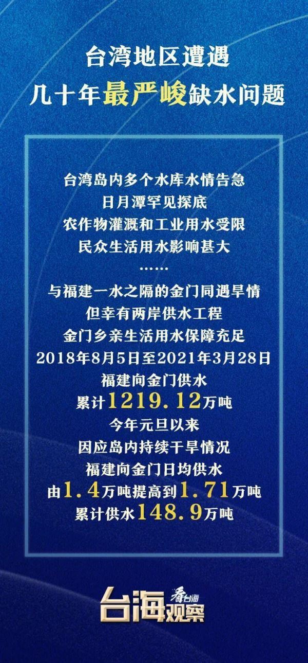 对此,国台办发言人朱凤莲向台湾民众表达关心和慰问,希望旱情尽快缓解。与福建一水之隔的金门,虽然也面临同样旱情,但受益于2018年8月建成的两岸供水工程,金门乡亲的生活用水有了充足保障。对此朱凤莲表示,两岸关系好,台湾才会好,台湾民众的福祉才会更好。希望两岸同胞共同努力,排除障碍,不断增进利益福祉。