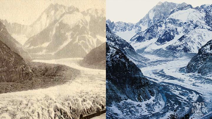△去年2月,马克龙总统到访位于法国阿尔卑斯山勃朗峰山区的冰海冰川。作为法国最长的冰川,近些年它因全球暖化而急剧萎缩。这是马克龙总统在个人社交媒体上发布的冰川消融对比照片(左为1910年,右为2020年)。