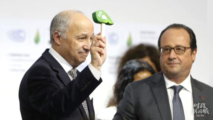 △2015年12月12日,巴黎气候变化大会主席、法国外长法比尤斯举起带有大会标志的绿色小锤,宣告里程碑式的《巴黎协定》诞生。(资料图)